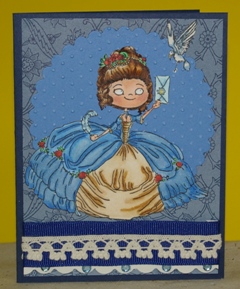 After coloring the image, I cut her out very closely and ran her through my Xyron to make her a sticker. To add the required frill, I added a small strip of cardstock which I scallop punched and placed small bling on every other scallop. To the scallop, I added a strip of navy ribbon and a frilly strip of crocheted trim.
